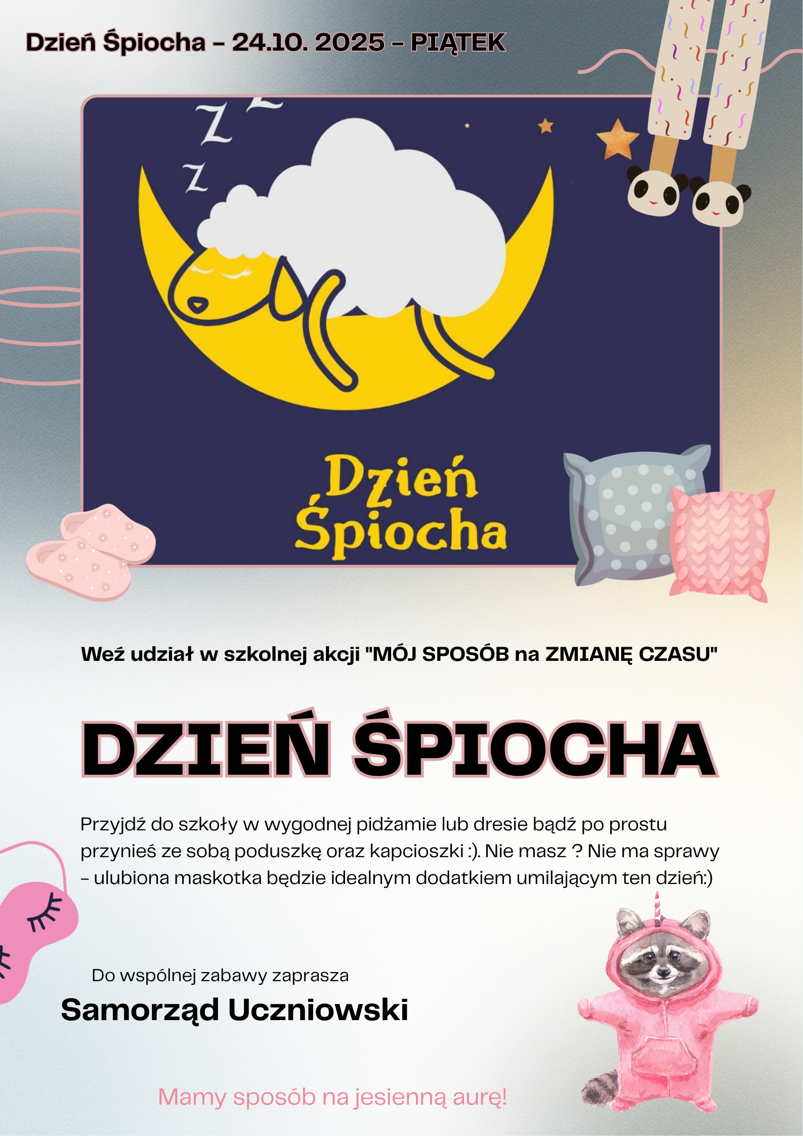 Dzień Śpiocha 20 października 2025 Samorząd Uczniowski zaprasza wszystkich CHĘTNYCH do udziału w akcji z okazji Dnia Śpiocha E.Czerwień – Skipiała M.Prątnicka J.Zawadzka Previous Poprzedni wpis