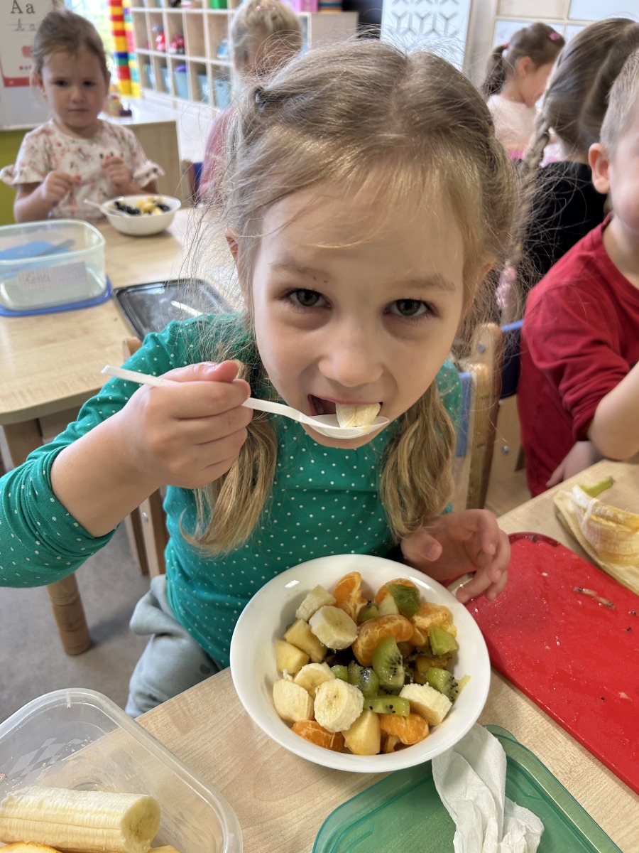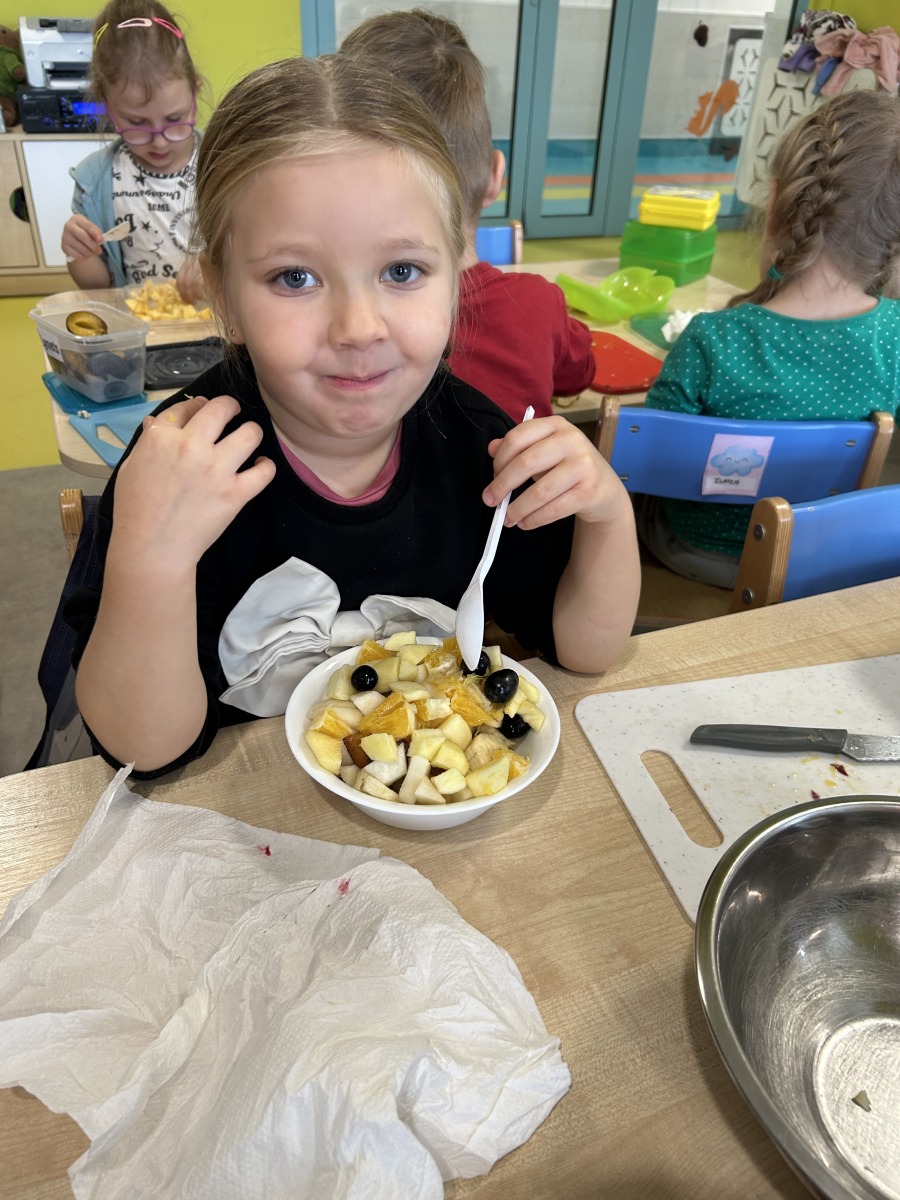 Z okazji Dnia Owoców i Warzyw dzieci zamieniły się w małych kucharzy i przygotowały własne sałatki owocowe ![]()