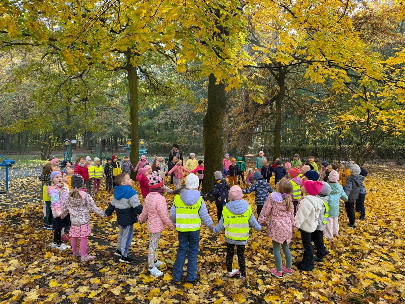 W czwartkowe przedpołudnie dzieci z grupy Tropicieli, Odkrywców i Zdobywców wybrały się na spacer do pobliskiego parku. Celem wyjścia było poznanie zmian zachodzących w przyrodzie jesienią, podczas spaceru przedszkolaki obserwowały kolorowe liście, zbierały kasztany i żołędzie, rozpoznawały drzewa po ich kształcie i barwie liści