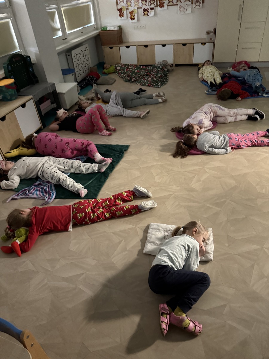 Podczas zabawy dzieci uczestniczyły w wielu atrakcjach: wspólnym czytaniu bajek, tańcach przy ulubionej muzyce, tworzeniu „nocnych” prac plastycznych. Nie zabrakło również zdrowych przekąsek i chwil relaksu na miękkich poduchach.