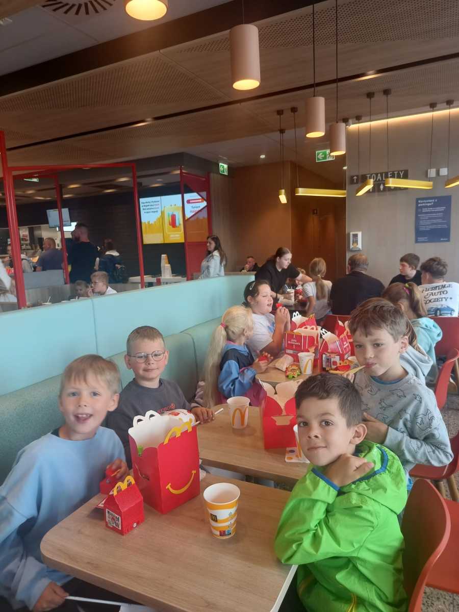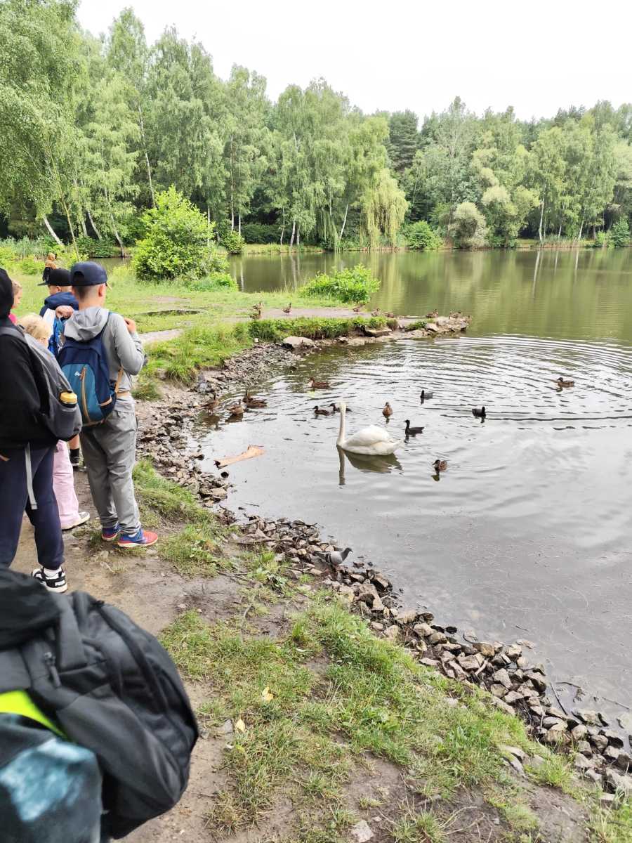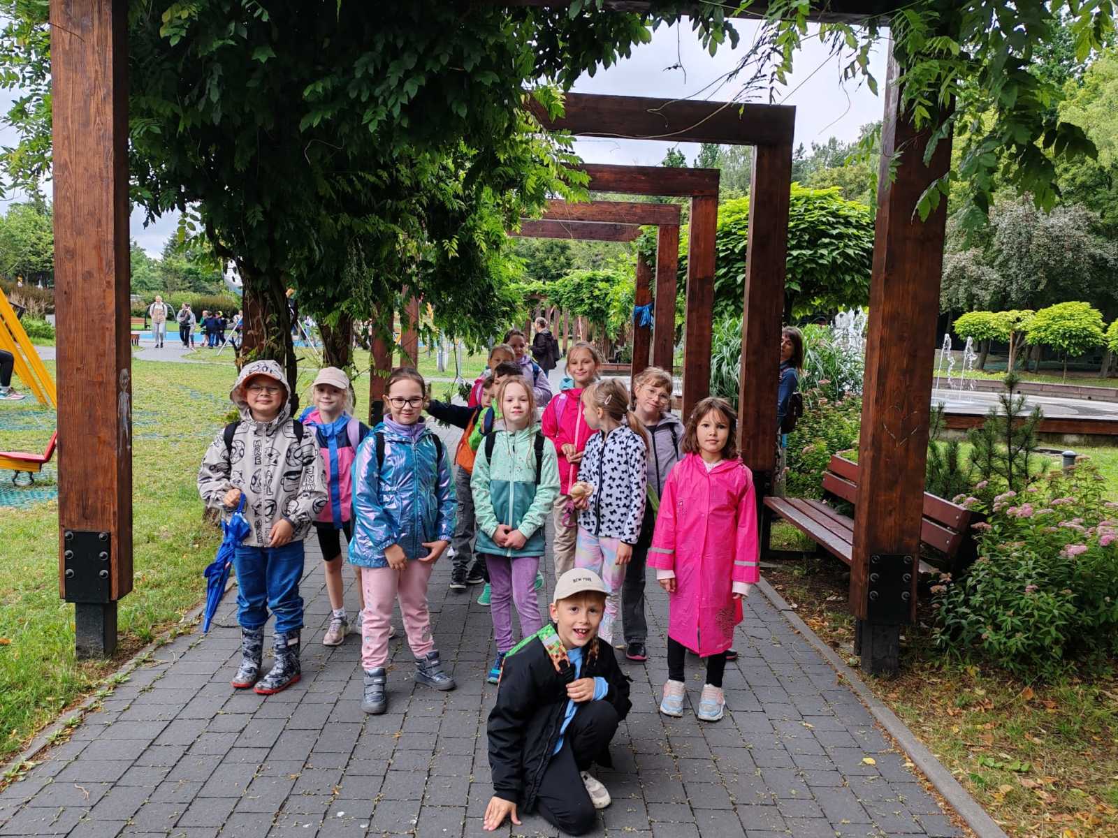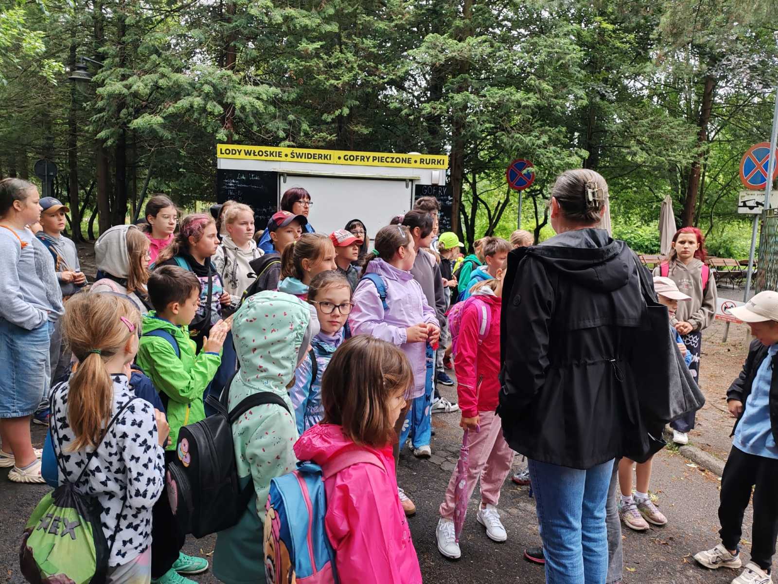 W dniu dzisiejszym udaliśmy się na ostatnią już wycieczkę naszych półkolonii, a mianowicie udaliśmy się do Sosnowca, aby spędzić dzień na zabawach w Parku Jordanowskim imienia Jacka Kuronia. Wszyscy trzymaliśmy kciuki za „pogodną pogodę”, ponieważ nadciągnęły „czarne chmury”, ale udało się. Hurra!!!!!! Tak oto spędziliśmy aktywnie ten brzydko zapowiadający się dzień: w związku z tym, że deszcz nie padał mieliśmy okazję skorzystać ze wszystkich atrakcji oferowanych przez park. Największą radość sprawił olbrzymi plac zabaw z mnóstwem sprzętów, takich jak: zjeżdżalnie, most zwodzony, tyrolka, huśtawki i mini siłownia. Przy pięknej fontannie zjedliśmy śniadanie i ruszyliśmy zwiedzać park, po drodze korzystając ze wszystkiego, co oferował nam park. Trasa biegła wokół cudnego stawu, zamieszkałego przez oswojone kaczki i łabędzie. Po drodze trafiliśmy na Mini Zoo, w którym mogliśmy obejrzeć: świnki morskie, króliki, papugi, sarny, pawie, a nawet domowe świnki wietnamskie. Po udanym zwiedzaniu i zabawie wyruszyliśmy na obiad do McDonald’sa ( którego, jak wiecie wszyscy uwielbiamy, chodź jest taki niezdrowy). Posiłek został zwieńczony przepysznym deserem, czyli lodami. Reasumując, wycieczka była odlotowa i należy ją powtórzyć w przyszłym roku. Z pewnością miejsce to zastąpi Jezioro Paprocany, które do zeszłego roku było stałym punktem półkolonii. Do zobaczenia jutro, w ostatnim dniu półkolonii.