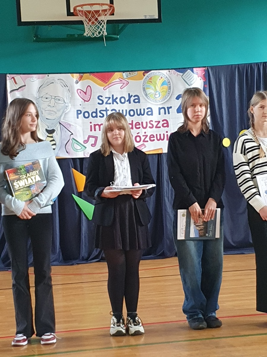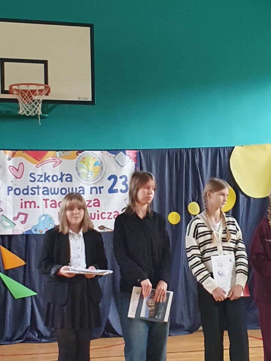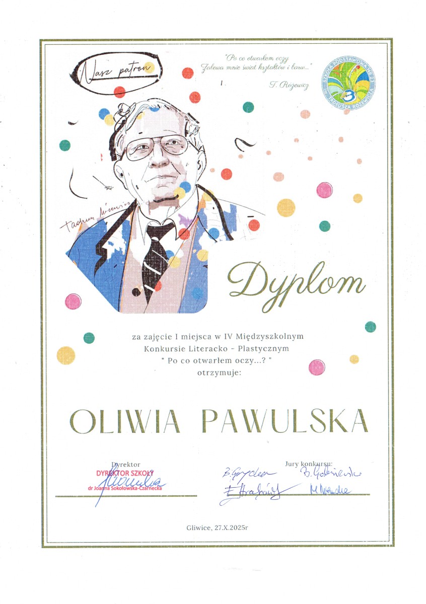 28 października 2025 r. w Zespole Szkolno – Przedszkolnym nr 16 w Gliwicach odbyło się rozstrzygnięcie i wręczenie nagród IV edycji Międzyszkolnego Konkursu Literacko- Plastycznego pod hasłem przewodnim “Po co otwarłem oczy…?” propagującego twórczość i sylwetkę Tadeusza Różewicza. Uczennica naszej szkoły z klasy 4b – Olivia P. – została Laureatką tego konkursu. Olivia otrzymała pamiątkowy dyplom oraz nagrody rzeczowe. Serdecznie gratulujemy Olivii i życzymy kolejnych sukcesów.