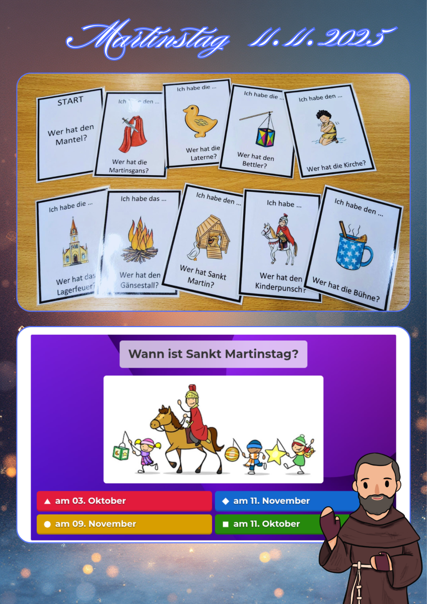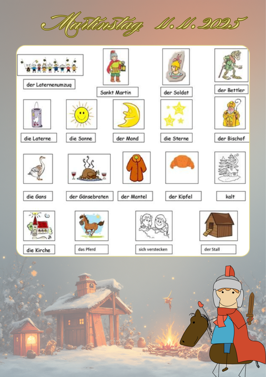 DZIEŃ ŚW. MARCINA to doskonała okazja, aby podczas zajęć z języka mniejszości niemieckiej połączyć wiedzę o historii i kulturze z umiejętnościami językowymi. Podczas lekcji uczniowie poznali lub przypomnieli sobie legendę o świętym Marcinie oraz tradycję i sposób obchodzenia tego dnia w Niemczech. Tematyczne quizy, gry, teksty, karty pracy, piosenki i filmiki gościły podczas zajęć we wszystkich klasach.