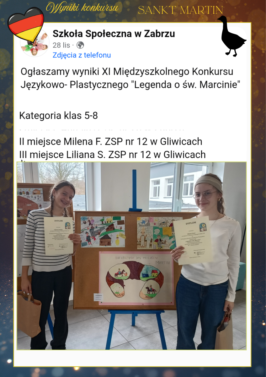 Mamy to !:) Serdeczne gratulacje dla Mileny i Lilki z klasy 6a, które zajęły kolejno II i III miejsce w międzyszkolnym konkursie językowo – plastycznym “Legenda o Świętym Marcinie”.