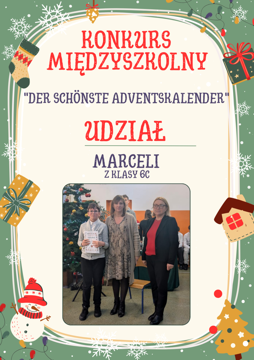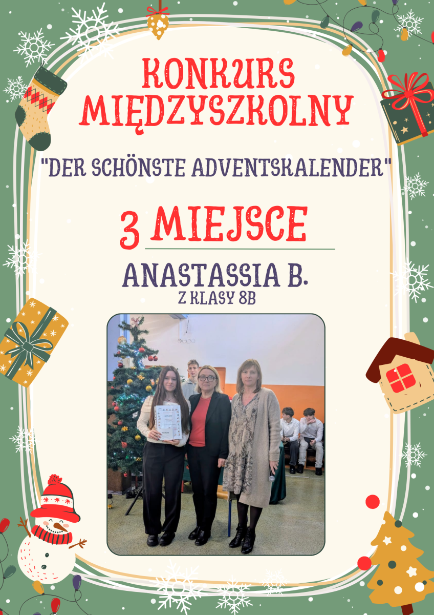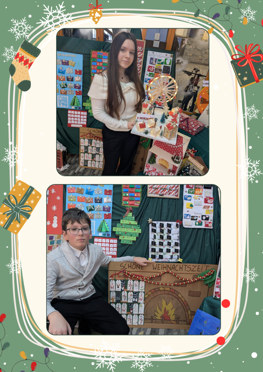 Gratulujemy 👏 Anastasii z klasy 8b, która zdobyła III miejsce w świątecznym konkursie organizowanym przez Zespół Szkół Łączności w Gliwicach. Anastasiia oraz Marceli z klasy 6c przygotowali przepiękne kalendarze adwentowe ze słownictwem bożonarodzeniowym w języku niemieckim.