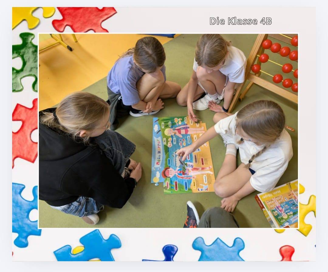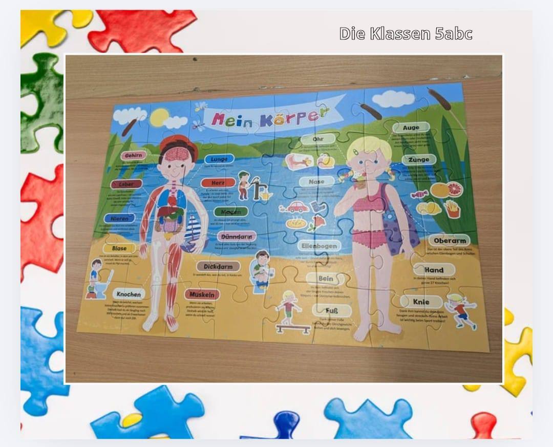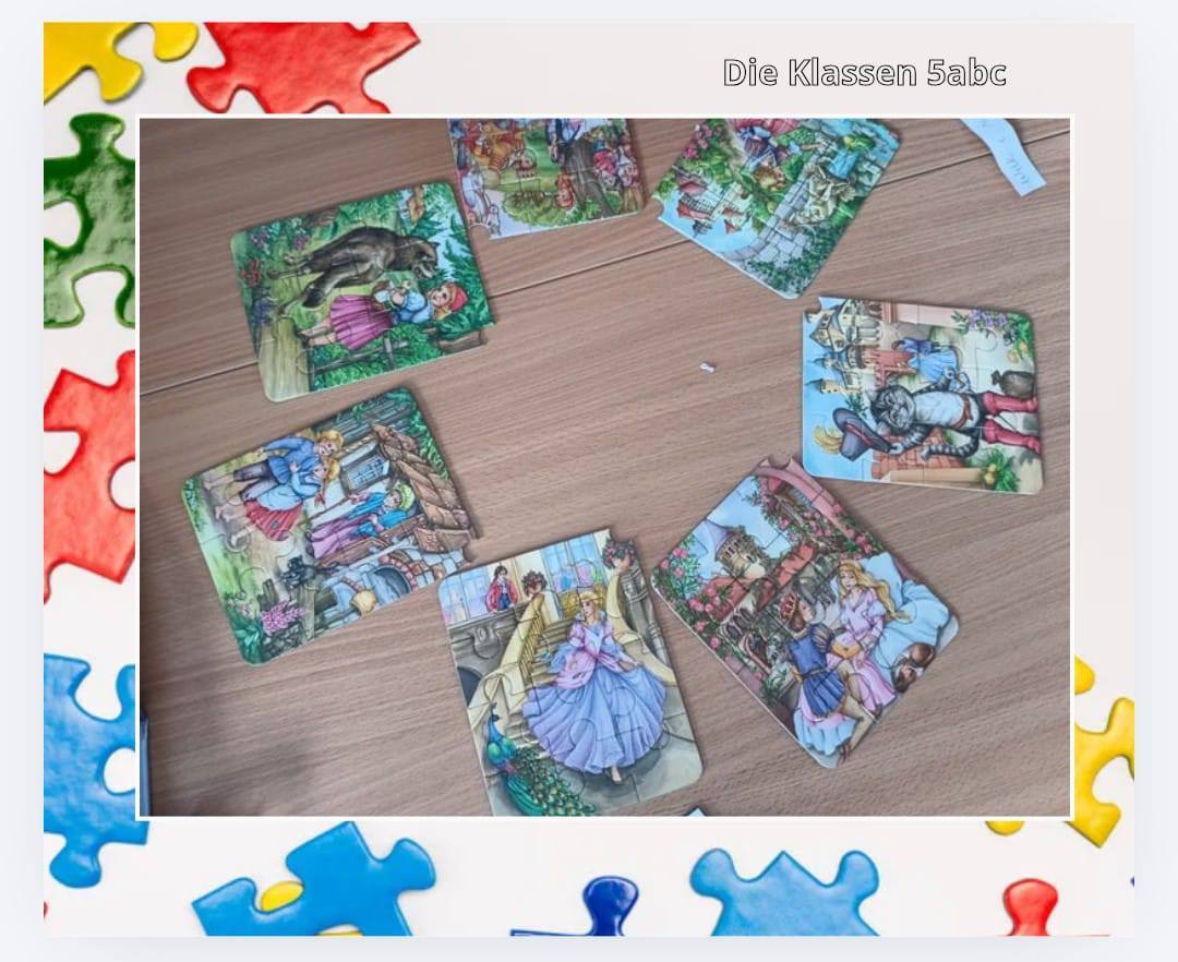 Poruszając na HiKu tematykę dzieł braci Grimm, nazywaliśmy również tytuły baśni na podstawie obrazków przedstawionych na puzzlach. Po ułożeniu językowych układanek o częściach ciała odczytywaliśmy i tłumaczyliśmy zdania o funkcjonowaniu naszego organizmu.