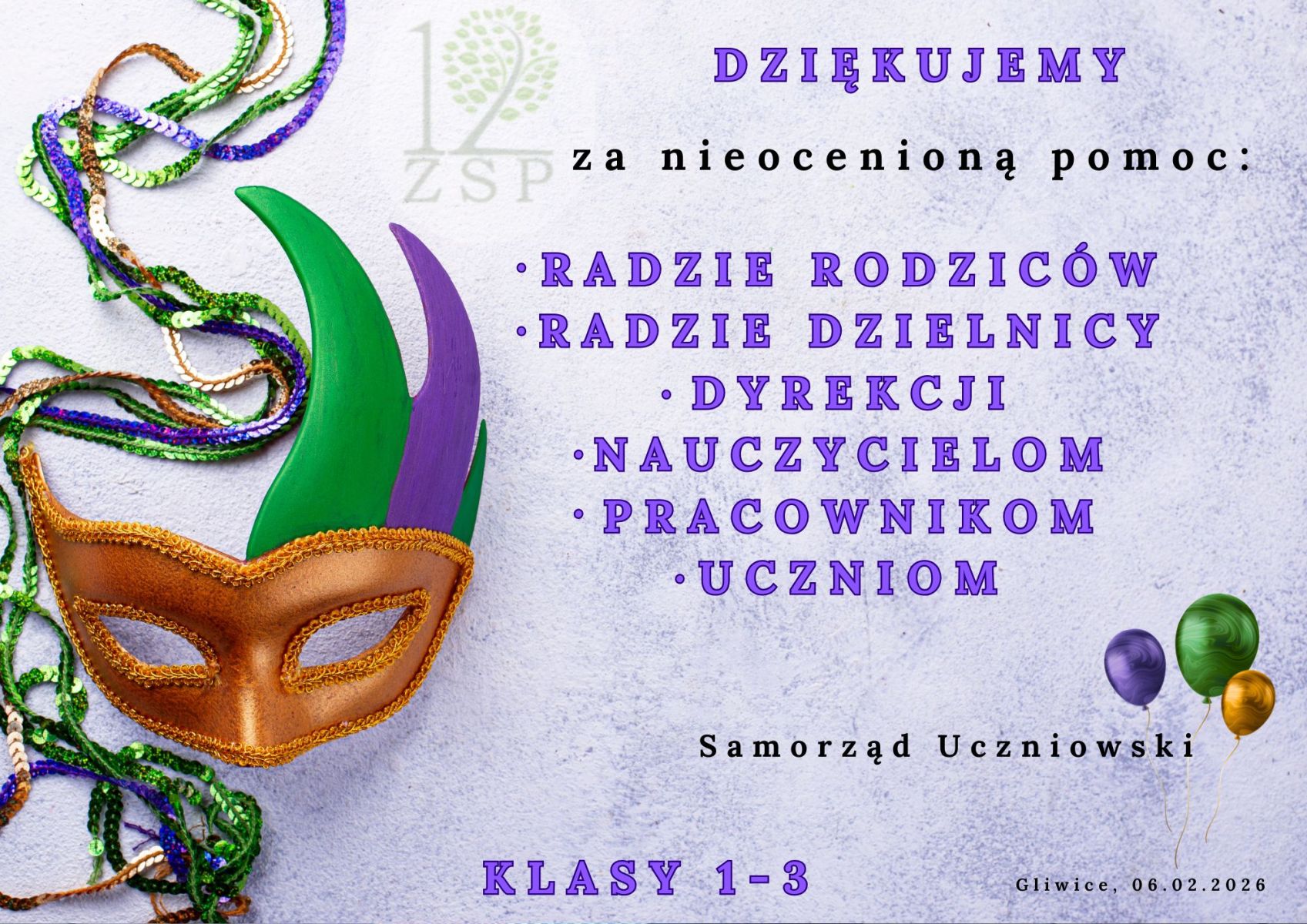 Bal karnawałowy dla klas 1-3 13 lutego 2026 Serdecznie zapraszamy do galerii zdjęć z balu karnawałowego klas młodszych w ZSP 12 E. Czerwień – Skipiała M. Prątnicka J. Zawadzka Previous 🧩 MIĘDZYNARODOWY DZIEŃ PUZZLI 🧩 Next Projekt ogólnopolski “Aktywna świetlica- Świetlicowe laboratorium “