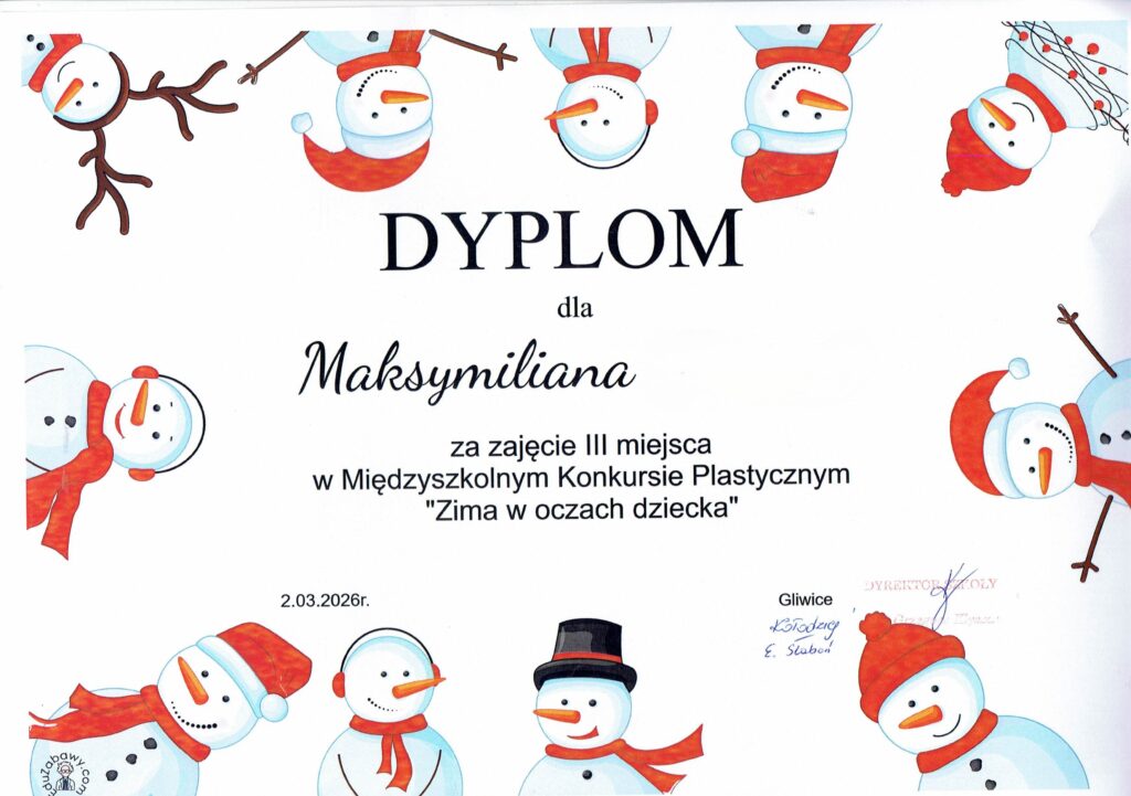 Miło nam poinformować, że uczeń naszej szkoły Maksymilian J. z klasy 4c zdobył III miejsce w Międzyszkolnym Konkursie Plastycznym ,,Zima w oczach dziecka”. Konkurs zorganizowany był przez Szkołę Podstawową nr 8 w Gliwicach. Maksymilianowi gratulujemy i życzymy kolejnych sukcesów.