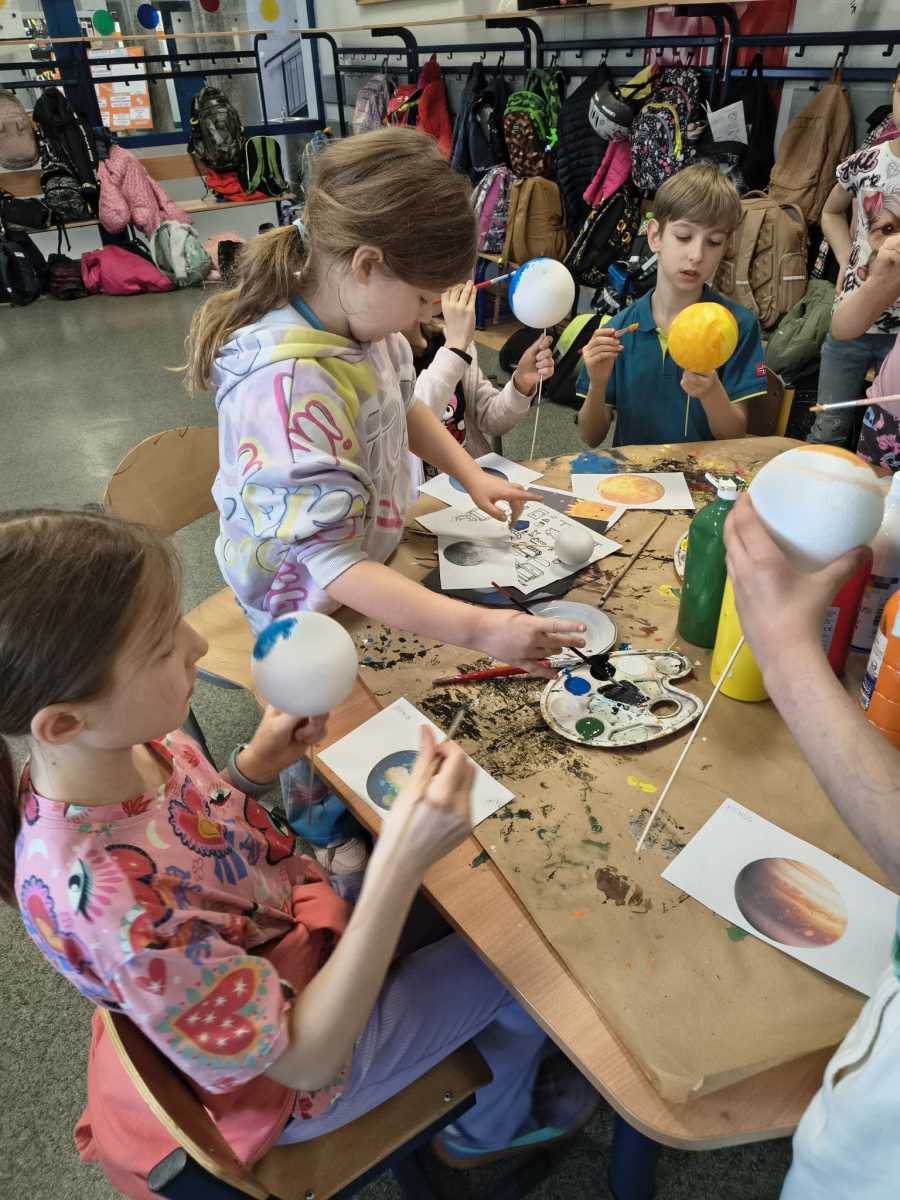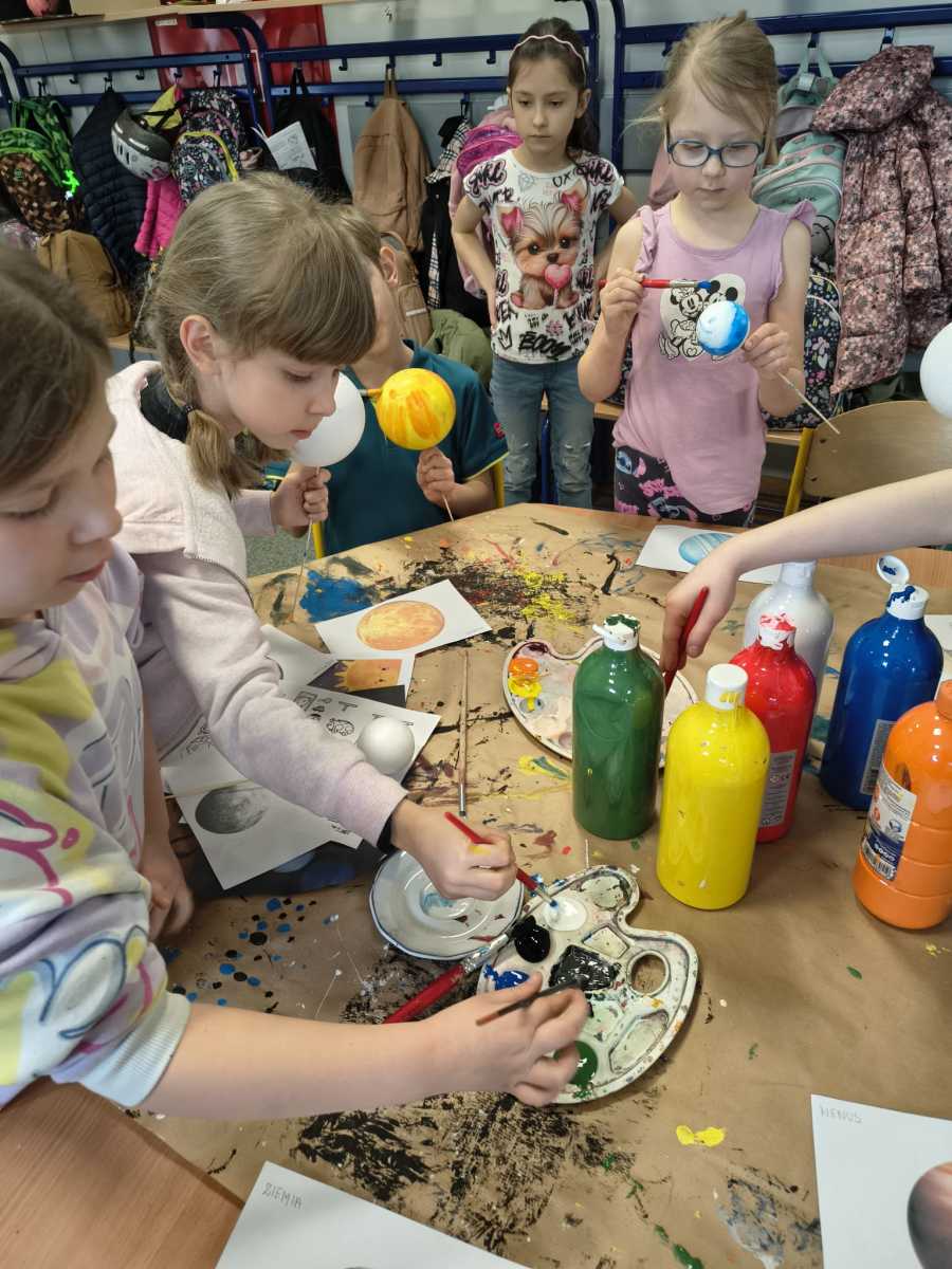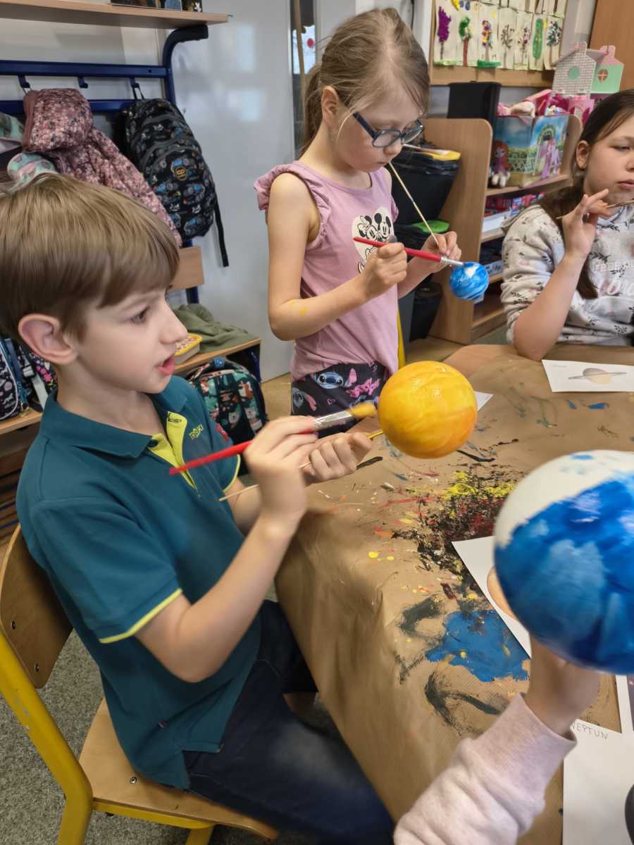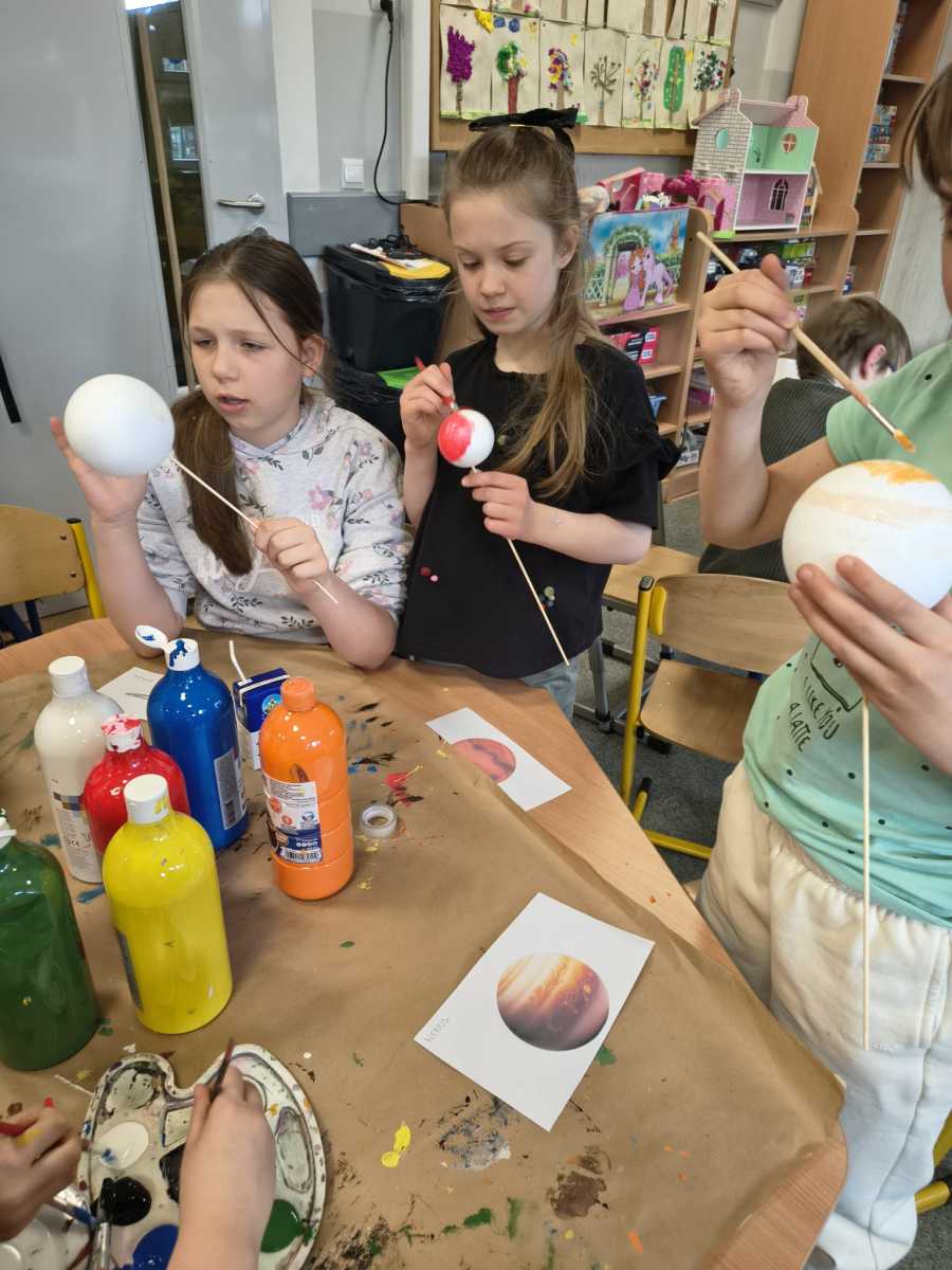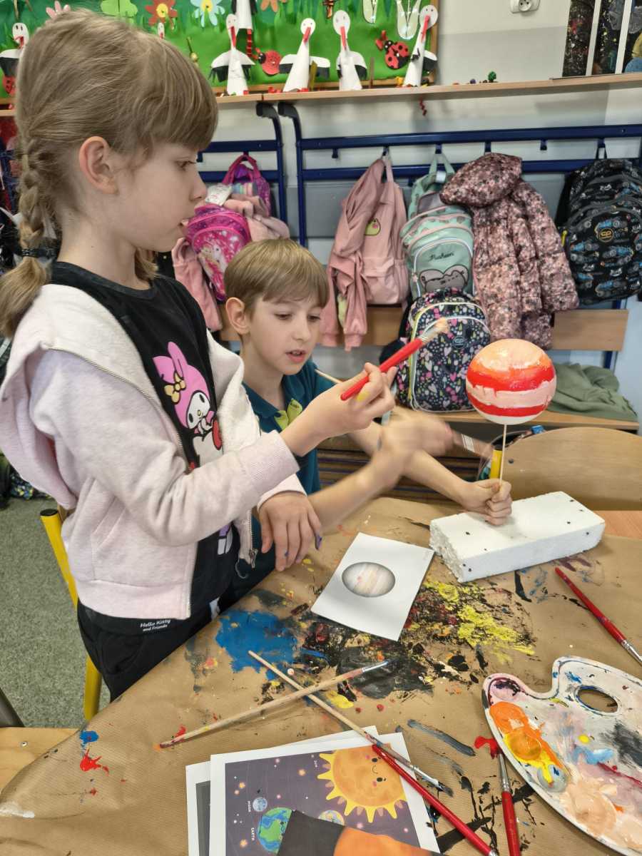 Kolejny moduł zrealizowany w marcu na świetlicy szkolnej dotyczył zgłębiania tajników kosmosu,budowy układu słonecznego i kosmosu.Uczniowie dowiedzieli się ile jest planet i jak się nazywają, co je wyróżnia. Na zakończenie zajęć dzieci przygotowały piękna makietę budowy układu słonecznego z wykorzystaniem kul styropianowych oraz sznurka i kolorowych farb.
