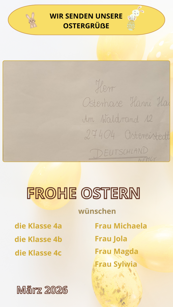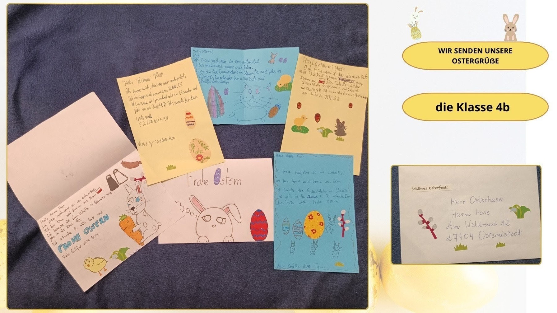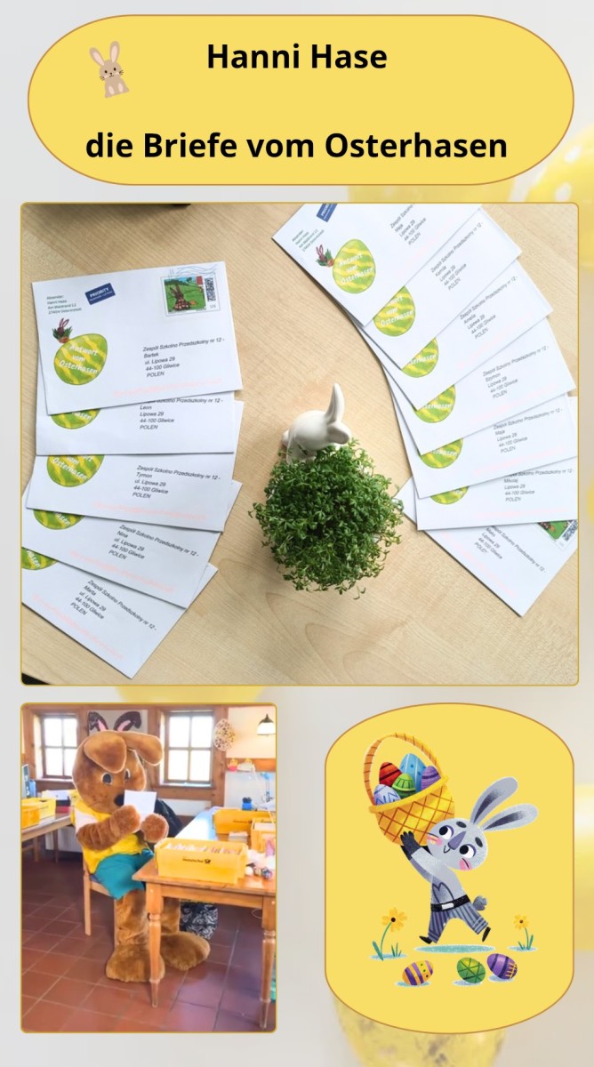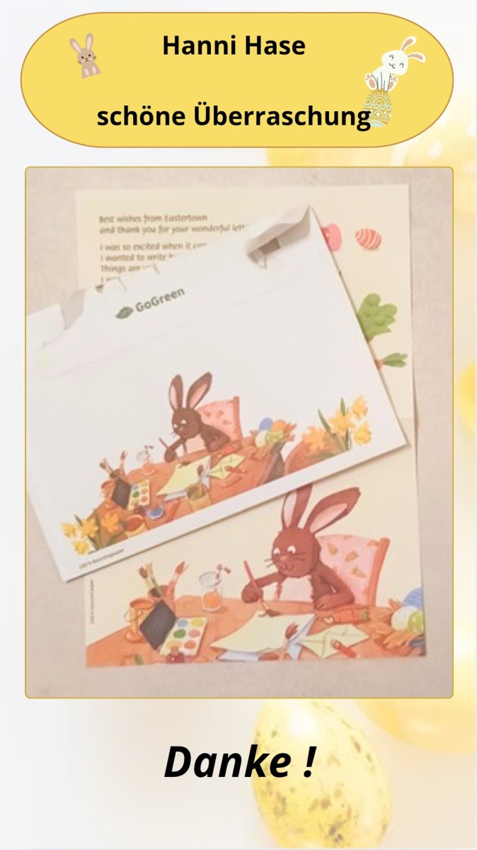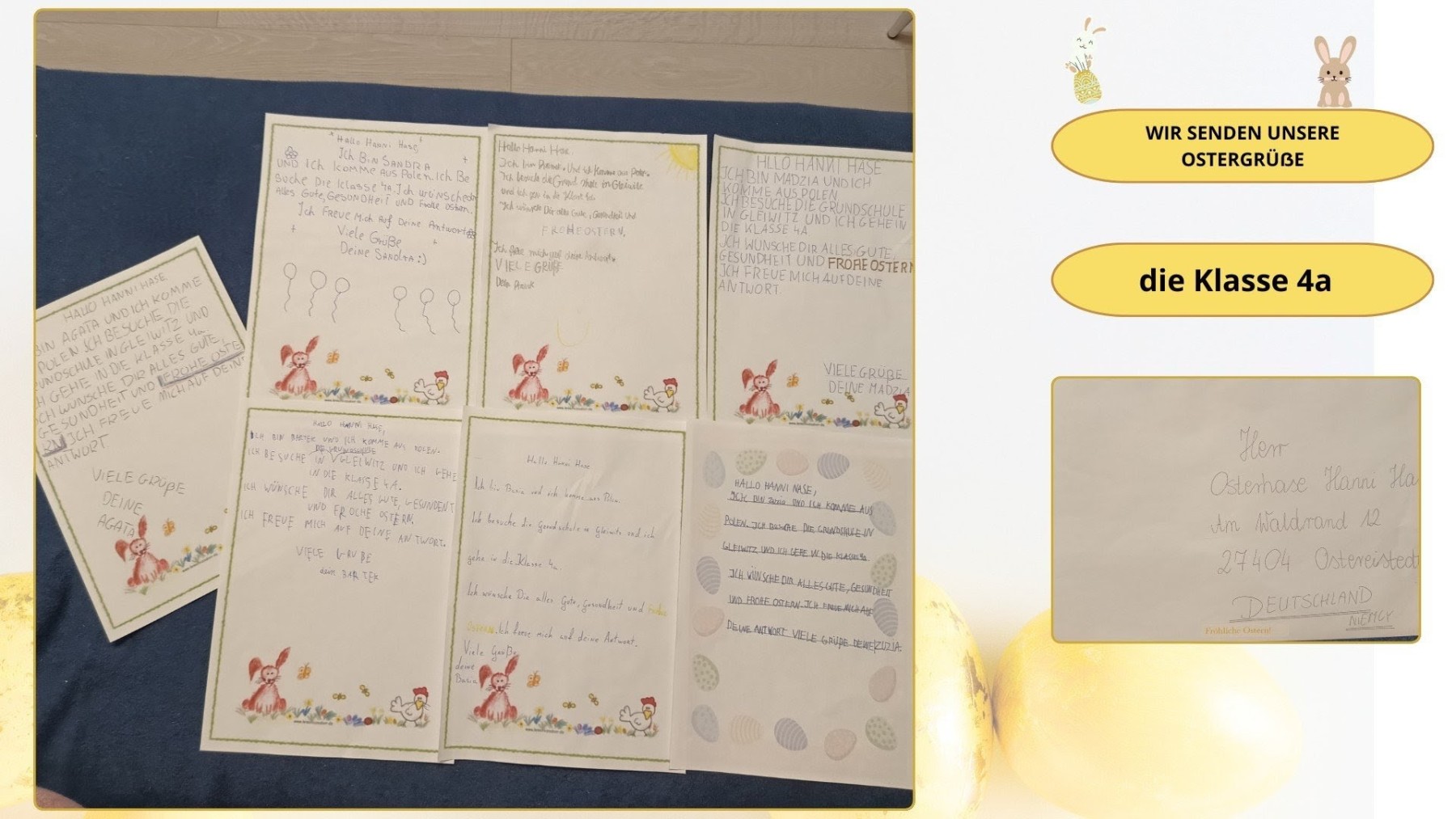 “WIELKANOC” na lekcjach z j.mniejszości niemieckiej w klasach 4 to nie tylko gry i zabawy językowe, ale przede wszystkim POCZTA do Hanni Hase. Uczniowie napisali odręcznie listy wysłane do zajączka z Niemiec. Bezpośrednio przed Świętami otrzymaliśmy odpowiedź:)